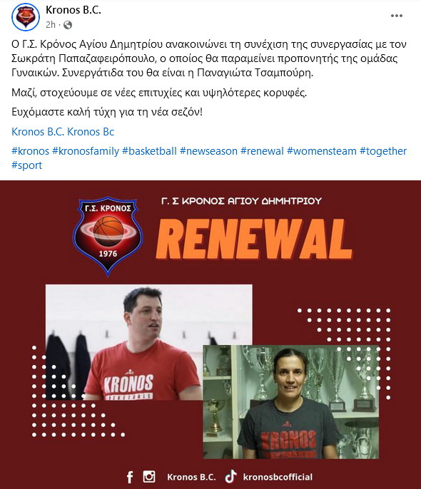 Ο Γ.Σ. Κρόνος Αγίου Δημητρίου ανακοινώνει τη συνέχιση της συνεργασίας με τον Σωκράτη Παπαζαφειρόπουλο, ο οποίος θα παραμείνει προπονητής της ομάδας Γυναικών. Συνεργάτιδα του θα είναι η Παναγιώτα Τσαμπούρη.