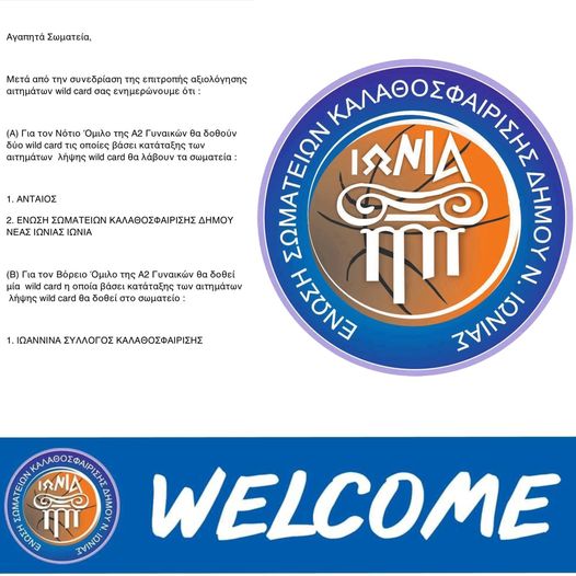 Η Ένωση Σωματείων Καλαθοσφαίρισης Δήμου Νέας Ιωνίας ανακοινώνει με μεγάλη χαρά πως απονεμήθηκε στην ομάδα μας wild card για την συμμετοχή μας στην Α2 Εθνική Κατηγορία Γυναικών, όπως μας ενημέρωσε επισήμως η Ελληνική Ομοσπονδία Καλαθοσφαίρισης, ΕΟΚ, χθες Τρίτη, 16 Ιουλίου, 2024.