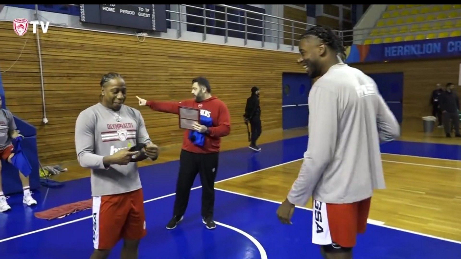 Χαλαρές στιγμές περνούν οι παίκτες του Ολυμπιακού στην τελευταία προπόνηση πριν το παιχνίδι του προημιτελικού του Κυπέλλου Ανδρών, με τον ΜακΚίσικ να συγκρίνει τα μαλλιά των Κάνααν και Ράιτ.