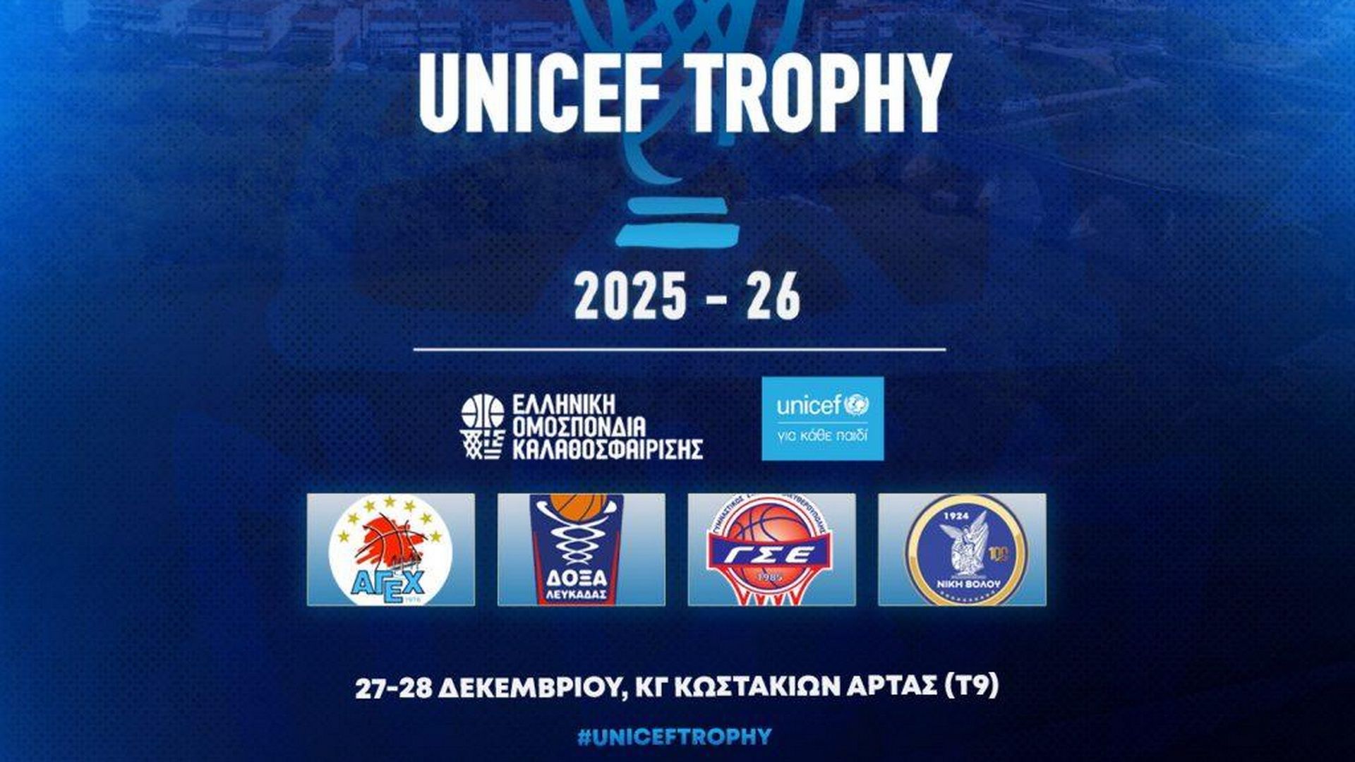 Η διοργάνωση θα πραγματοποιηθεί το διήμερο 27-28 Δεκεμβρίου 2025 στην Αρτα, με μια από τις πόλεις, που έχουν αγκαλιάσει το μπάσκετ, να αναλαμβάνει άλλο ένα σημαντικό γεγονός. Το Νέο Κλειστό Τ9 Κωστακίων είναι εκείνο, όπου θα αναδειχθεί ο φετινός νικητής του UNICEF Trophy, το οποίο για πρώτη φορά ταξιδεύει εκτός Αττικής, με τους προηγούμενους τελικούς να έχουν διεξαχθεί σε ΟΑΚΑ, Ανω Λιόσια και Γλυφάδα.