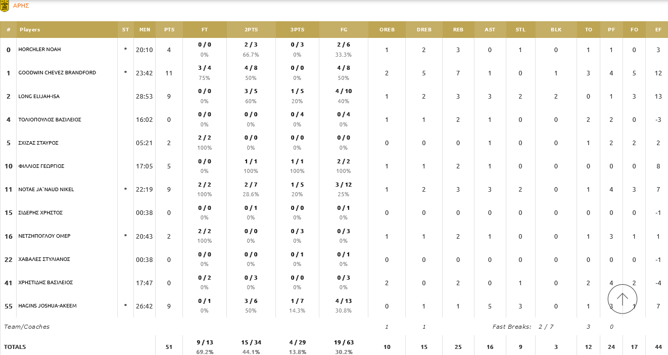 Ξεχώρισαν: Εξαιρετική εμφάνιση από τον Μπλακ με 14 πόντους και επτά ριμπάουντ, ενώ από τον Άρη, ο Γκούντγουιν είχε 11 πόντους.