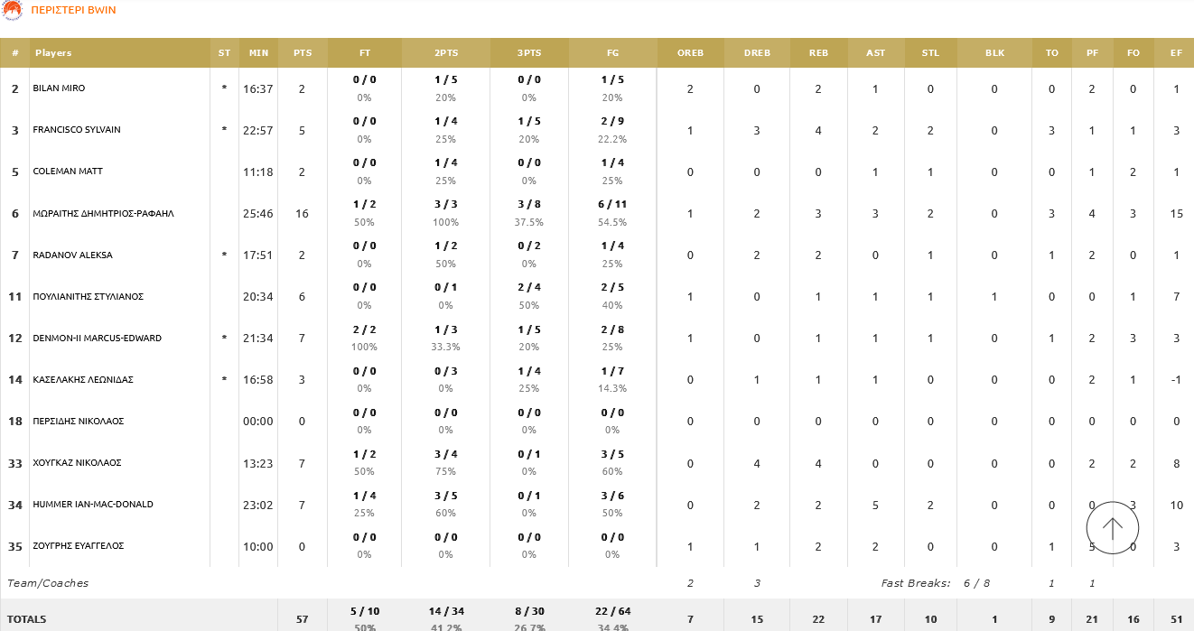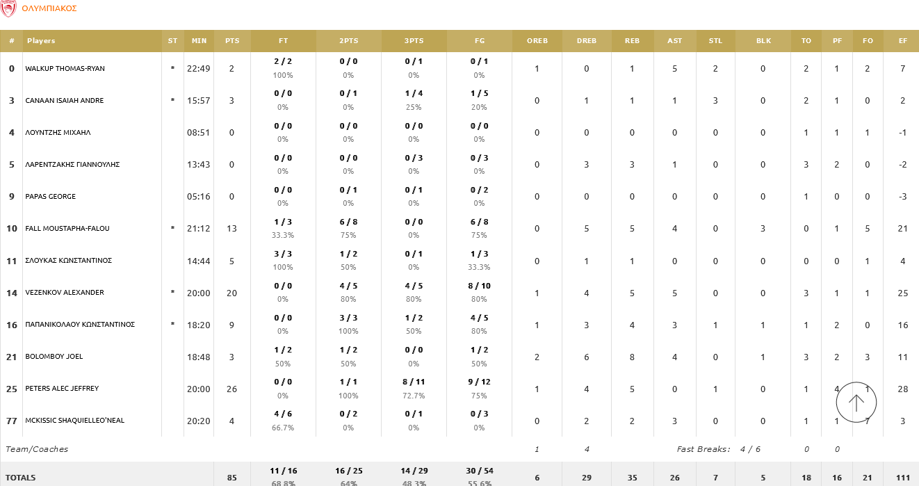 Ξεχώρισαν: Βεζένκοβ με 20 πόντους και Φαλ με 13, ξεχώρισαν από πλευράς Ολυμπιακού, ενώ για το Περιστέρι, ο Μωραΐτης είχε 16 πόντους.