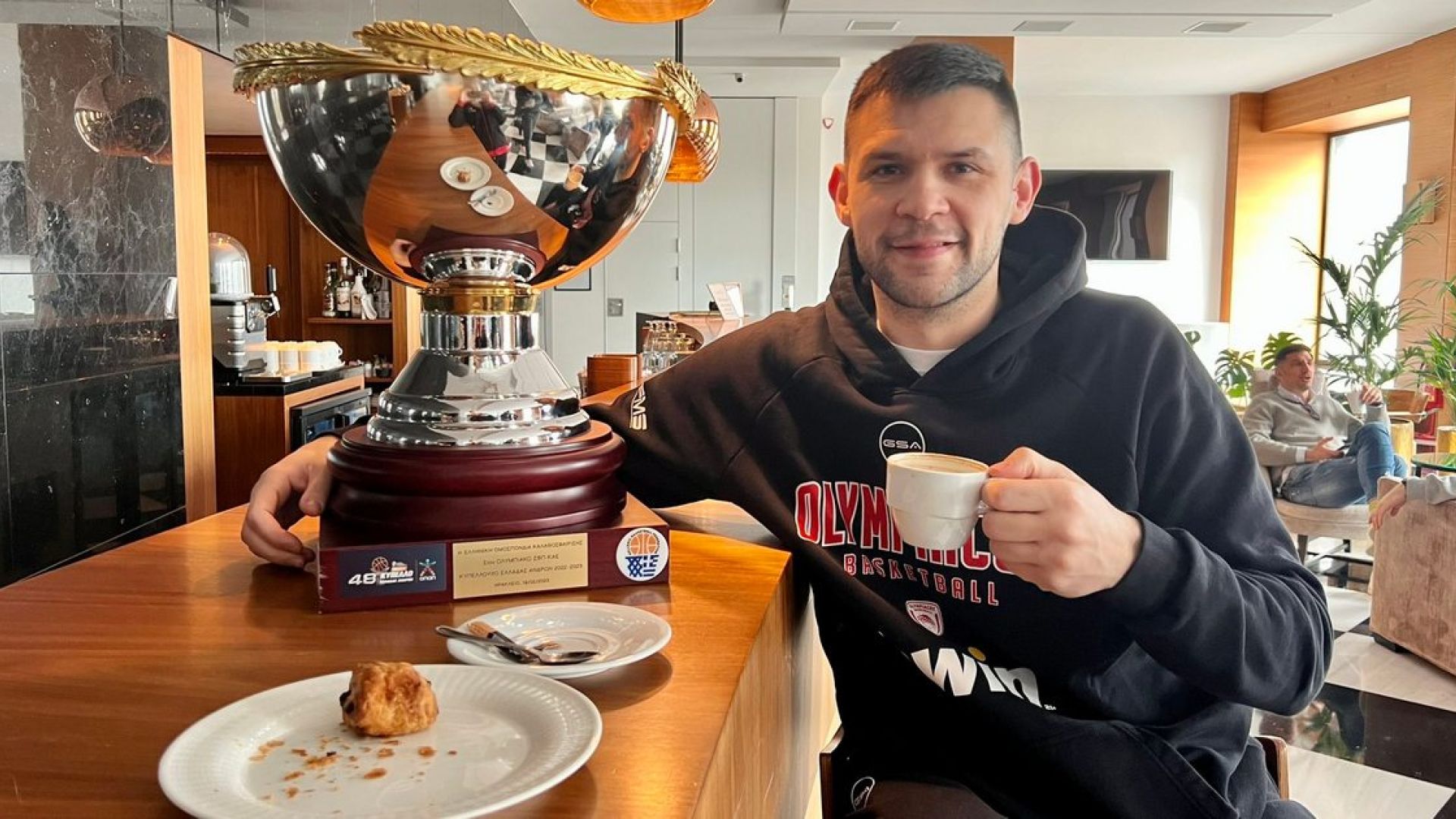 Η αποστολή των Πειραιωτών διανύει τις τελευταίες της ώρες στην Κρήτη, με τον Έλληνα αθλητή να γίνεται το... πρόσωπο της πρώτης ανάρτησης της Δευτέρας 20/2/2023, δηλαδή της επομένης της κατάκτησης του τροπαίου.
