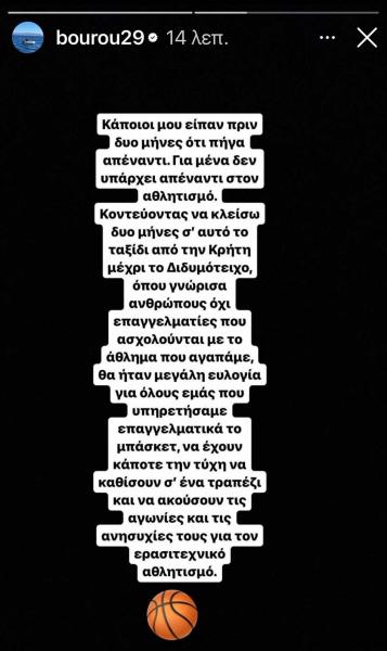 Ο Γιάννης Μπουρούσης, μέλος του συνδυασμού "Πρώτα το Μπάσκετ", έστειλε το δικό του μήνυμα ενόψει των ερχόμενων εκλογ΄ων της ΕΟΚ,μέσω ενός story στο Instagram, στο οποίο δήλωσε πως θέλει πραγματικά να καθίσει σε ένα τραπέζι με ανθρώπους του αθλήματος και να ακούσουν τις αγωνίες και τις ανησυχίες του ερασιτεχνικού αθλητισμού.