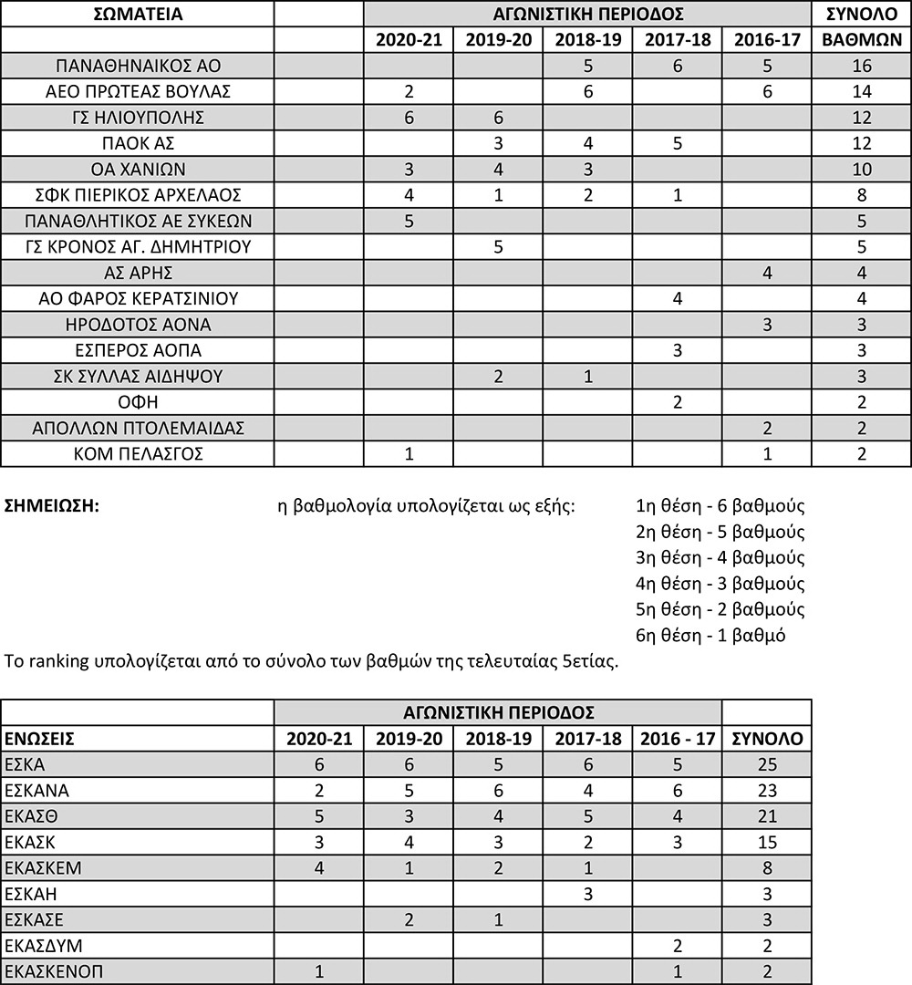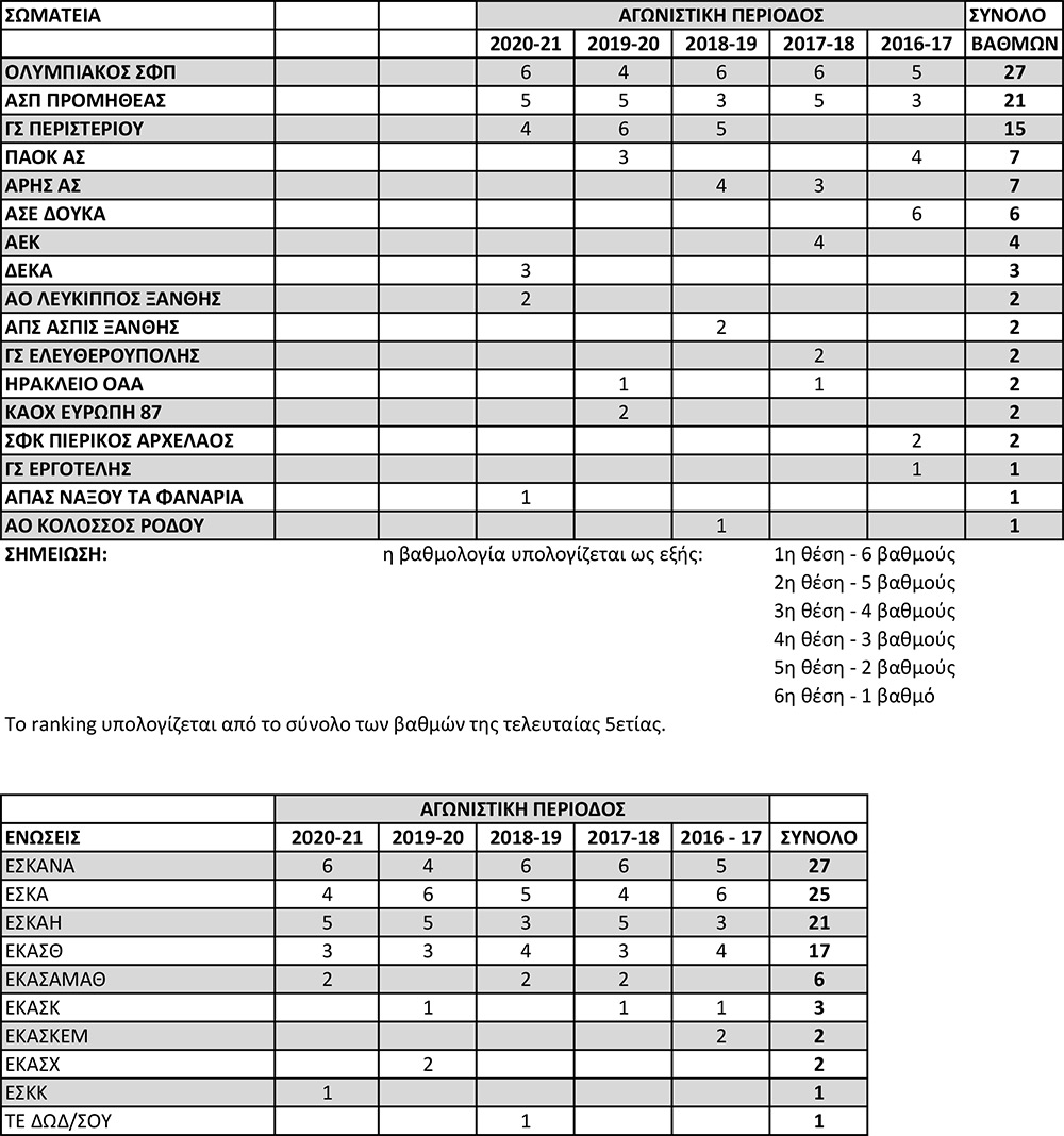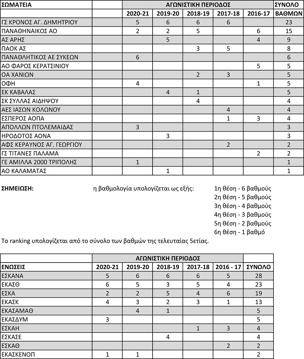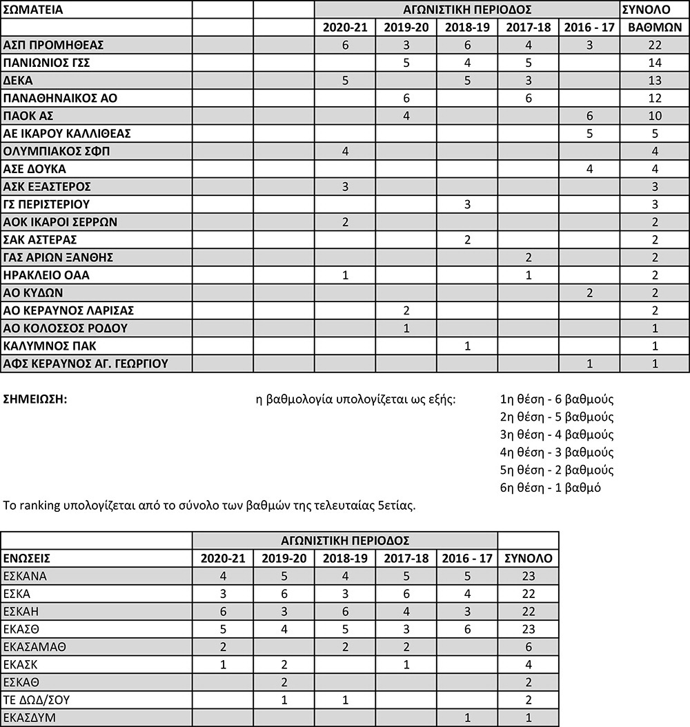 Η ΕΟΚ έδωσε στην δημοσιότητα το ranking των πανελληνίων πρωταθλημάτων Εφήβων, Νεανίδων, Παίδων και Κορασίδων, με βάση τα αποτελέσματα της τελευταίας πενταετίας.