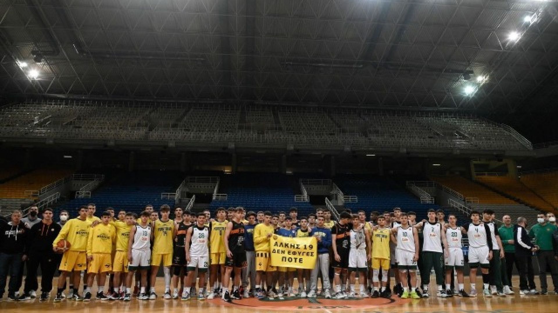 Οι αθλητές των τεσσάρων ομάδων από το Περιστέρι, τον Προμηθέα, τον Παναθηναικό και τον Άρη, που συμμετέχουν στο U18 Rising Stars της ΕΟΚ, στο ΟΑΚΑ, το απόγευμα του Σαββάτου 5 Φεβρουαρίου, σήκωσαν ένα πανό στην μνήμη του δολοφονηθέντος 19χρονου Άλκη Καμπανού.