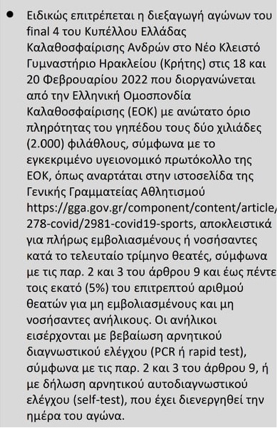 Δεκτό έγινε από την Πολιτεία το αίτημα της ΕΟΚ, που συνοδεύτηκε από την κατάθεση του ειδικού για τη συγκεκριμένη διοργάνωση Υγειονομικού Πρωτοκόλλου και των αυστηρών εγγυήσεων και μέτρων τήρησης αυτού, για διεξαγωγή του Final 4 του κυπέλλου Ανδρών με κάλυψη του 40% της χωρητικότητας του γηπέδου «Δύο Αοράκια» στο Ηράκλειο, δηλαδή, παρουσία 2.000 θεατών.