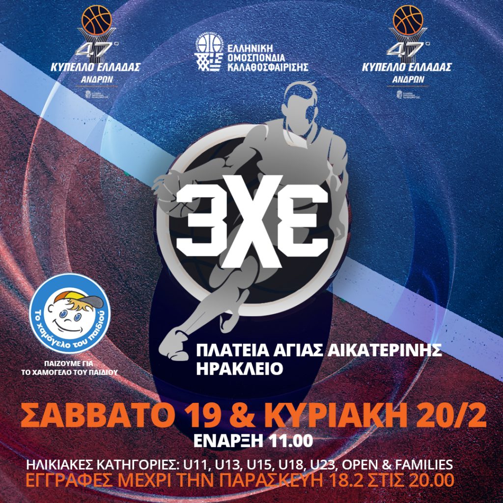 Η Ελληνική Ομοσπονδία Καλαθοσφαίρισης (ΕΟΚ), η Ένωση Καλαθοσφαιρικών Σωματείων Κρήτης (ΕΚΑΣΚ),ο Δήμος Ηρακλείου και η Περιφέρεια Κρήτης συνδιοργανώνουν Φεστιβάλ μπάσκετ 3x3 το Σάββατο και την Κυριακή 19-20 Φεβρουαρίου αφιερωμένο στο Χαμόγελο του Παιδιού.