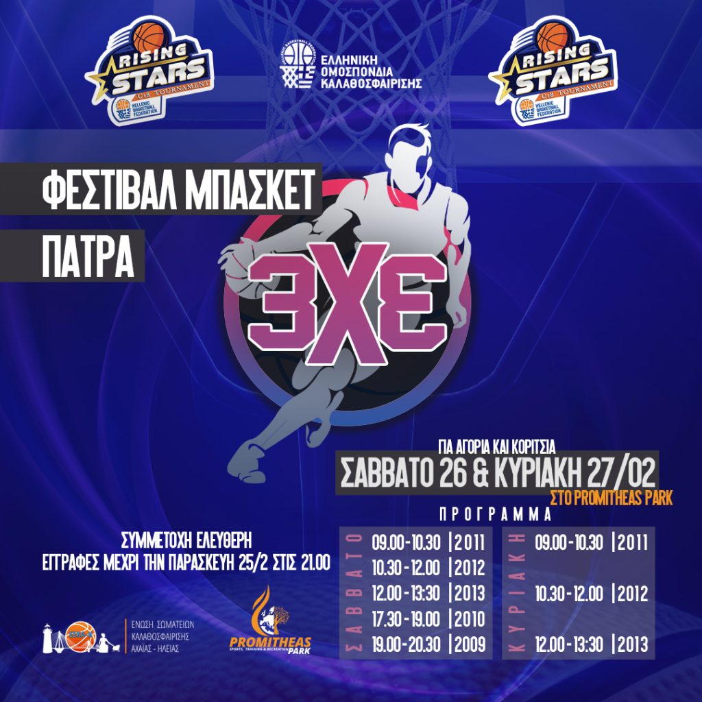 Το Final 8 του U18 Rising Stars φιλοξενείται στην Πάτρα, αλλά δεν θα είναι ο μοναδικός πόλος έλξης για τους φίλους του μπάσκετ. Η ΕΟΚ, σε συνεργασία με την ΕΣΚΑΗ και τον Προμηθέα Πάτρας διοργανώνουν Φεστιβάλ Μπάσκετ 3Χ3 στις 26 και 27 Φεβρουαρίου. Ένα Σαββατοκύριακο γεμάτο μπάσκετ στο προπονητικό κέντρο του Προμηθέα.