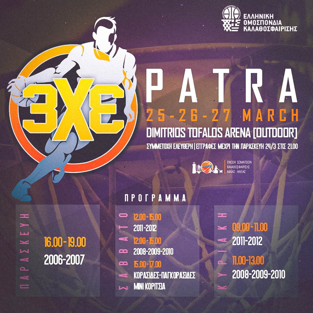 Μετά το Ηράκλειο, η Πάτρα θα είναι ο επόμενος σταθμός του 3Χ3, καθώς στον εξωτερικό χώρο του «Δ. Τόφαλος» θα πραγματοποιηθεί τριήμερο φεστιβάλ μπάσκετ, από τις 25-27 Μαρτίου.