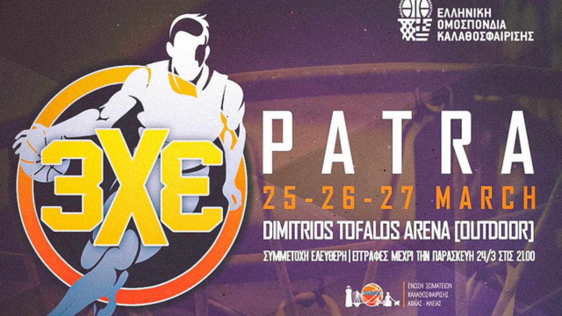Το 3Χ3 επιστρέφει με ένα φεστιβάλ μπάσκετ στην Πάτρα. Το τριήμερο 25-27 Μαρτίου στον εξωτερικό χώρο του ΠΕΑΚ Πάτρας «Δημήτρης Τόφαλος» το μπάσκετ θα διεκδικήσει το χώρο του την αγάπη του κόσμου, αλλά και –το πιο σημαντικό- τη συμμετοχή σου.