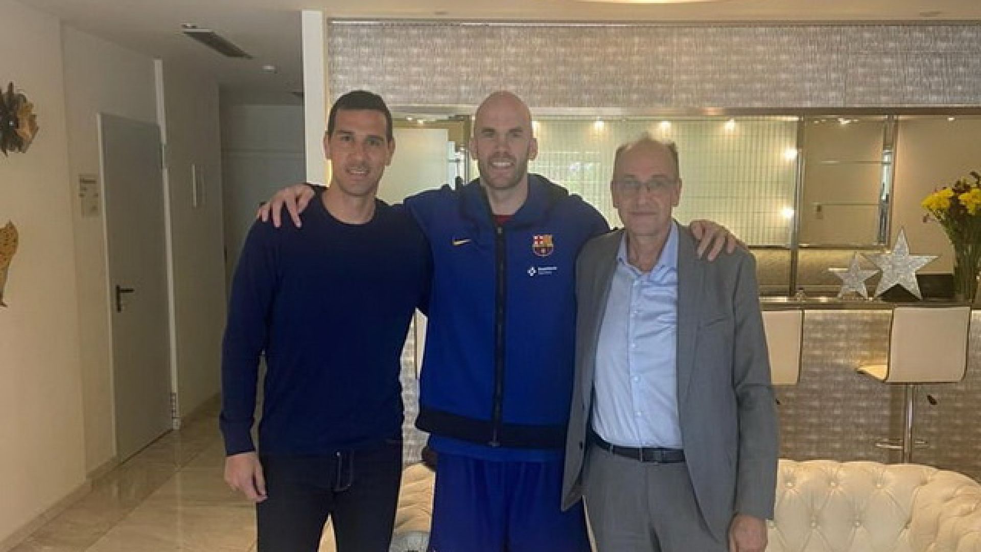 Τον Νικ Καλάθη επισκέφτηκαν στο ξενοδοχείο όπου διέμεινε η Μπαρτσελόνα στην Αθήνα με την αφορμή του αγώνα της με τον Ολυμπιακό, ο πρόεδρος της ΕΟΚ Βαγγέλης Λιόλιος και ο GM της Εθνικής Ανδρών, Νίκος Ζήσης.