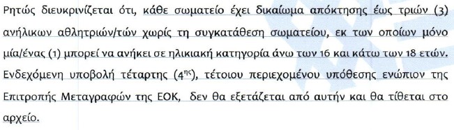 Κι αφορά ένα πολύ σημαντικό κομμάτι του ελληνικού μπάσκετμπολ. Επί της ουσίας η ΕΟΚ βάζει εμπόδιο στο παιδωμάζωμα. Δεν μπορεί να το σταματήσει τελείως, δεν υπάρχει τρόπος να συμβεί αυτό το 2022, αλλά μπήκε περιορισμός και επιτρέπεται σε ένα σωματείο να κάνει μέχρι 3 συνολικά μεταγραφές ανηλίκων χωρίς τη συγκατάθεση του σωματείου. Μάλιστα μπορεί να πάρει μόνο έναν από 16 ως 18 ετών. Άρα μόνο ένας έφηβος μπορεί να αποχωρήσει δίχως συγκατάθεση.