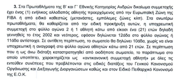 Συγκεκριμένα, όπως αναφέρει η προκήρυξη, στα πρωταθλήματα Β’ και Γ’ Εθνικής, δικαίωμα συμμετοχής ένας ξένος παίκτης προερχόμενος από την Ευρωπαϊκή Ζώνη της FIBA ή από ειδικό καθεστώς, που περιλαμβάνει μετανάστες, παίκτες προερχόμενους από εμπόλεμες ζώνες κλπ.