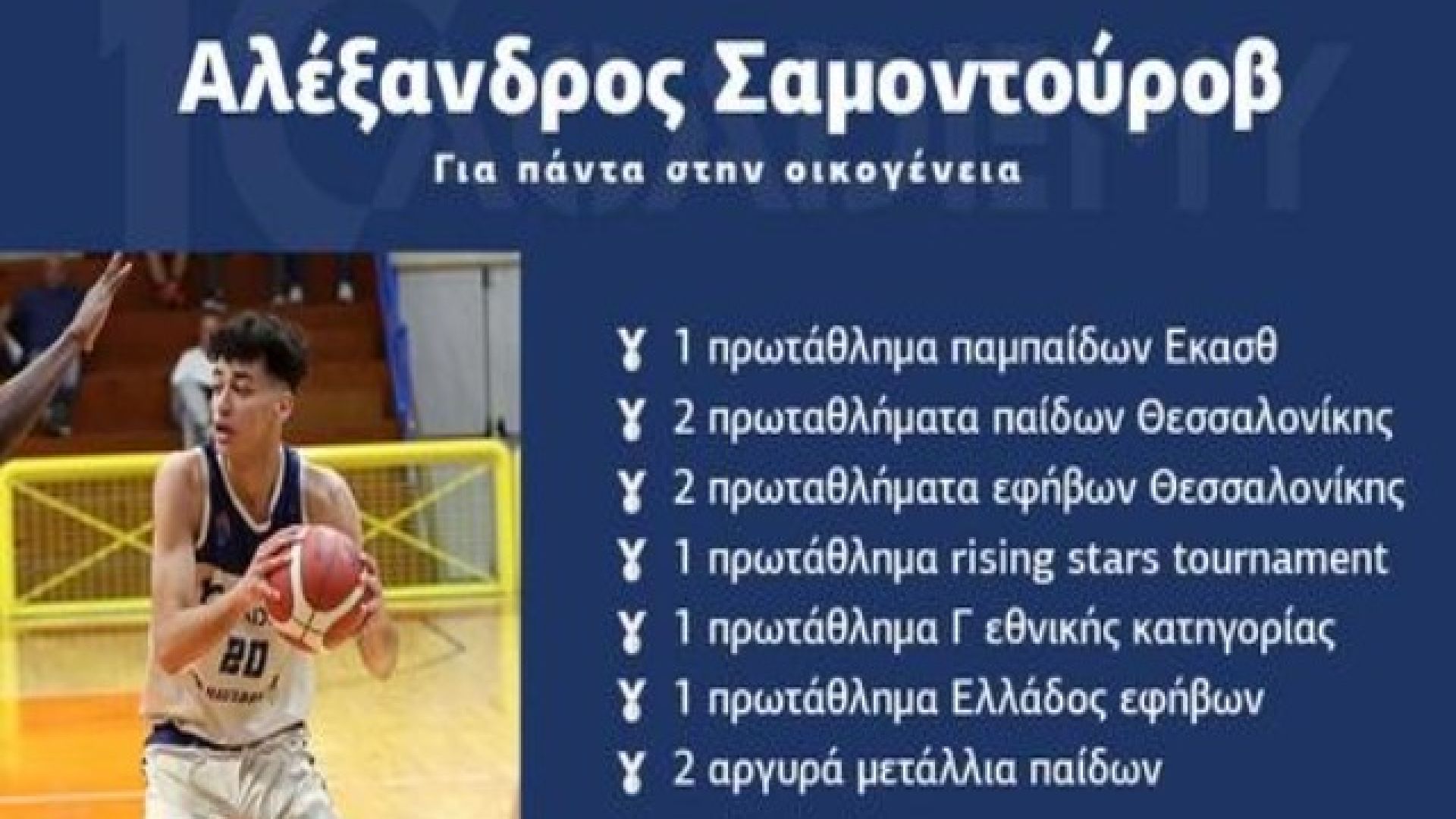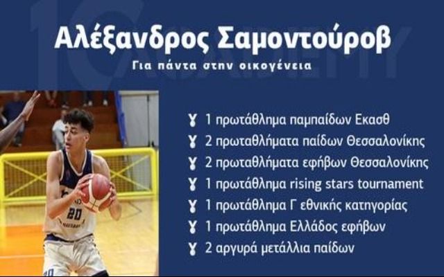 «Ο Αλεξανδρος Σαμοντούροβ γεννήθηκε και μεγάλωσε στον Εύοσμο. Ξεκίνησε το μπάσκετ στα 10 του χρόνια στην 10Academy. Στα 17 του χρόνια μεταγράφηκε στον Παναθηναϊκό. Η ύψιστη τιμή για έναν αθλητή είναι η κλήση στην Εθνική Ανδρών. Ο σύλλογός μας είχε την τιμή να δει αθλητή της αγωνιζόμενο στην Γ’ Εθνική να καλείται απο τον ομοσπονδιακό μας προπονητή Δημήτρη Ιτούδη. Όλη αυτή η διαδρομή που μοιάζει ονειρική για έναν Έφηβο συνοδεύεται από κάποια χαρακτηριστικά : Πίστη στην ομάδα, αφοσίωση στο Basketball, ήθος, δουλειά, αγάπη για τους συμπαίκτες και σεβασμός στους προπονητές . Του ευχόμαστε να είναι δυνατός, να βάζει πάντα υψηλούς στόχους να μείνει ταπεινός.