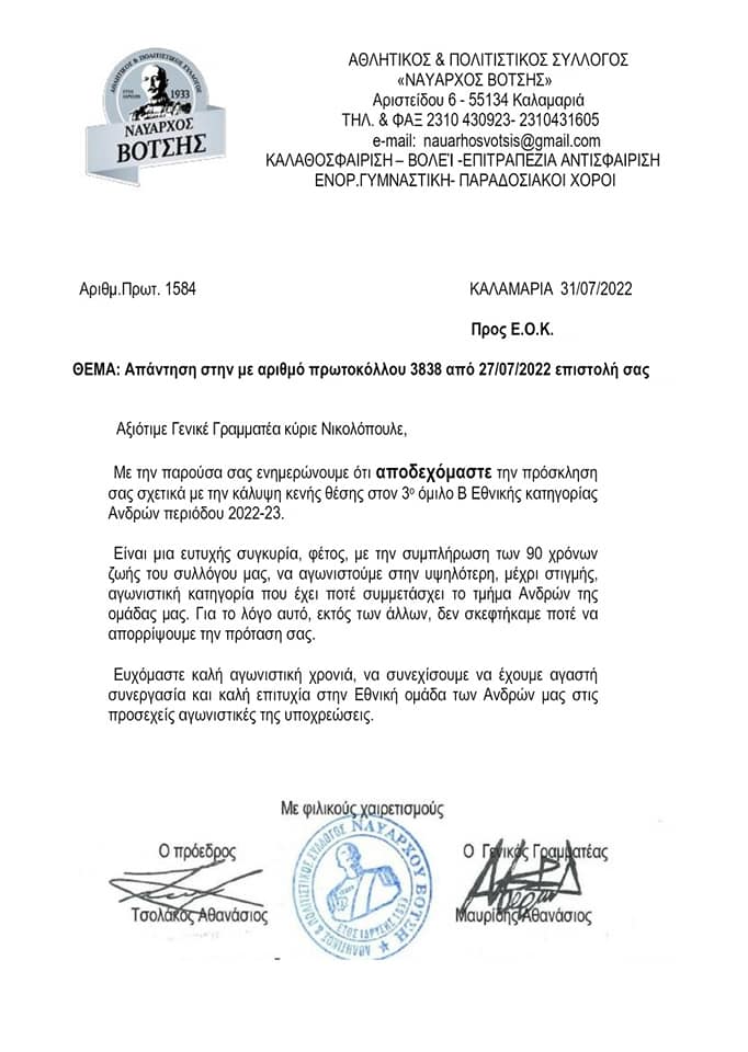 «Με την συμπλήρωση των 90 χρόνων ζωής του Συλλόγου μας, με μεγάλη χαρά σας ανακοινώσουμε ότι την επόμενη αγωνιστική περίοδο το τμήμα ανδρών της ομάδας μας θα αγωνιστεί στο πρωτάθλημα της Β' Εθνικής κατηγορίας, την υψηλότερη μέχρι στιγμής της ιστορίας μας!!!