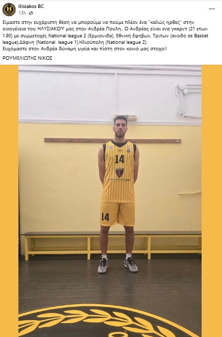 Είμαστε στην ευχάριστη θέση να μπορούμε να πούμε πλέον ένα "καλώς ηρθες" στην οικογένεια του ΗΛΥΣΙΑΚΟΎ μας στον Ανδρέα Πουλη.. Ο Ανδρέας είναι ενα γκαρντ (21 ετων 1.90) με συμμετοχές National league 2 (Ερμιονιδα), Εθνική Εφηβων, Τριτων (ανοδο σε Basket league),Δάφνη (National league 1),Ηλιούπολη (National league 2).