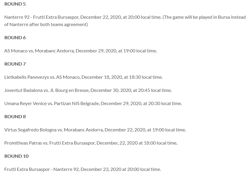 Συγκεκριμένα, το επίσημο πρόγραμμα του Eurocup αναφέρει πως το εξ αναβολής παιχνίδι της 8ης αγωνιστικής ανάμεσα στον Προμηθέα και την Μπούρσασπορ, διεξάγεται στις 22 Δεκεμβρίου στις 18:00, ενώ δύο ώρες αργότερα, η τουρκική ομάδα πρέπει να βρίσκεται πίσω στην χώρα της, για ακόμα ένα εξ αναβολής παιχνίδι, αυτή τη φορά για την 5η αγωνιστική, απέναντι στην Ναντέρ.