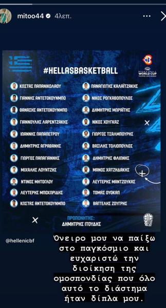«Όνειρο μου να παίξω στο παγκόσμιο και ευχαριστώ τη διοίκηση της ομοσπονδίας που όλο αυτό το διάστημα ήταν δίπλα μου» αναφέρει στην ανάρτηση του ο άσος του Παναθηναϊκού.