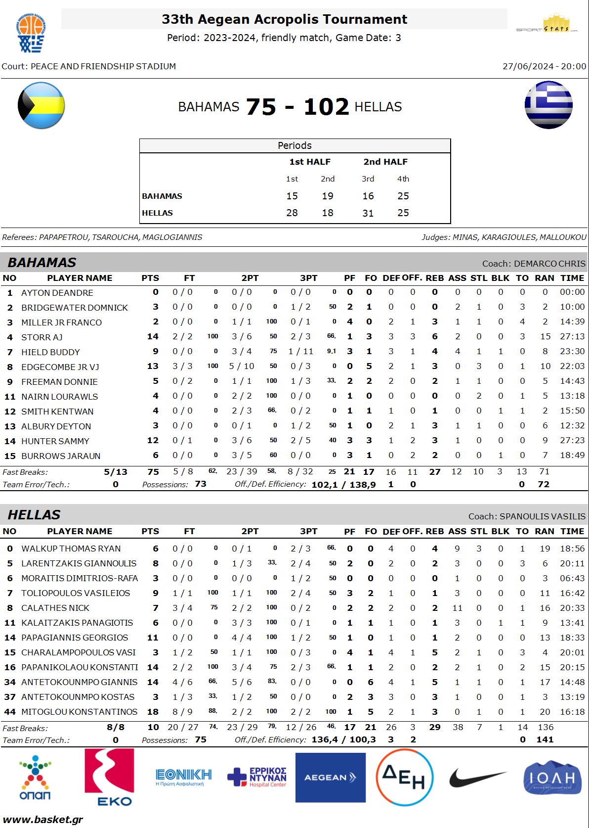 Ξεχώρησαν: Ο Γιάννης Αντετοκούνμπο με 14 πόντους και 5 ρειμπάουντ και ακολούθησε ο Κώστας Παπανικολάου με 14 πόντους και αυτός. Από τις Μπαχάμες πρώτος σκόρερ ο Στορ με 14 πόντους , εν΄ω ο Χιλντ έμεινε χαμηλά με 9 πόντους με 1/11 τρίποντα.