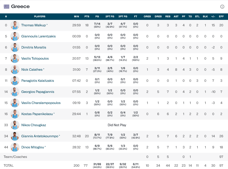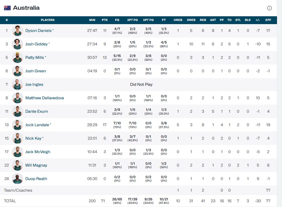 Ξεχώρισαν: Ο Αντετοκούνμπο, με 20 πόντους, επτά ριμπάουντ και έξι ασίστ… παρέσυρε όποιον Αυστραλό βρέθηκε στο διάβα του. Σπουδαίο ματς από τον Μήτογλου με 13 πόντους και επτά ριμπάουντ, ενώ ο Τολιόπουλος είχε 13 πόντους, ανάμεσα τους το τεράστιο τρίποντο για το 69-74. Για την Αυστραλία. 17 πόντους είχε ο Λαντέιλ, 13 ο Μιλς και 11 ο Ντάλιενς, ενώ ο Γκίντι είχε εννιά πόντους, 11 ριμπάουντ και έξι ασίστ.