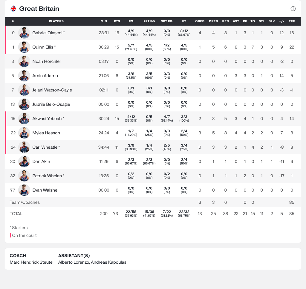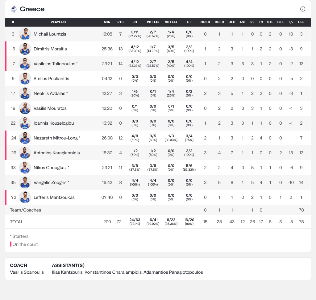 Ξεχώρισαν: Έλις και Γιεμπόα ήταν συμπαραστάτες του Ολασένι, καθώς αμφότεροι πέτυχαν από 15 πόντους. Από την Ελλάδα ξεχώρισαν οι Τολιόπουλος και Μωραΐτης που πέτυχαν από 14 και 13 πόντους αντίστοιχα