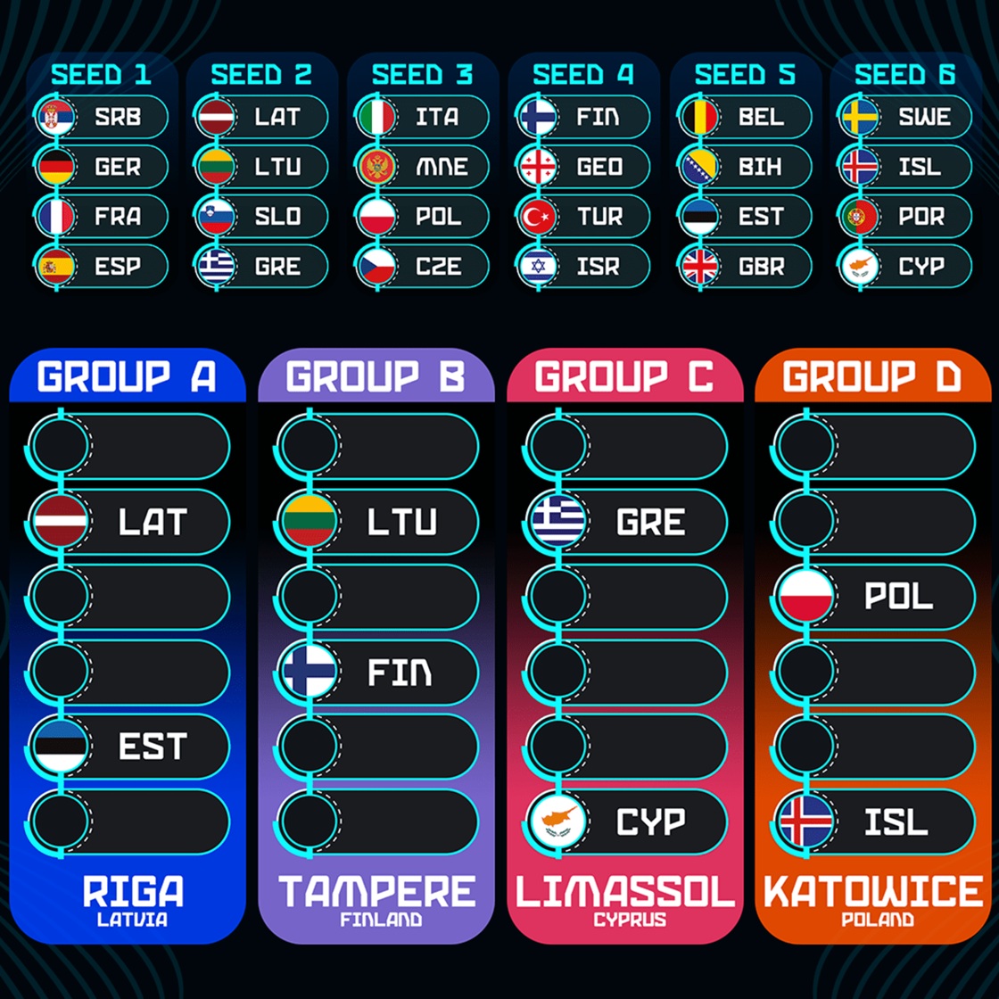 Οι 24 συμμετέχουσες ομάδες έχουν χωριστεί σε έξι γκρουπ δυναμικότητας βάσει της κατάταξης των χωρών στην FIBA. Κάθε όμιλος θα απαρτίζεται από μία ομάδα από κάθε γκρουπ δυναμικότητας. Η Ελλάδα βρίσκεται στο δεύτερο γκρουπ δυναμικότητας, μαζί με Λετονία, Λιθουανία και Σλοβενία, με τις οποίες δεν μπορεί να κληρωθεί, όπως και με την Τουρκία από το πρώτο γκρουπ, μετά από απόφαση της FIBA Europe.