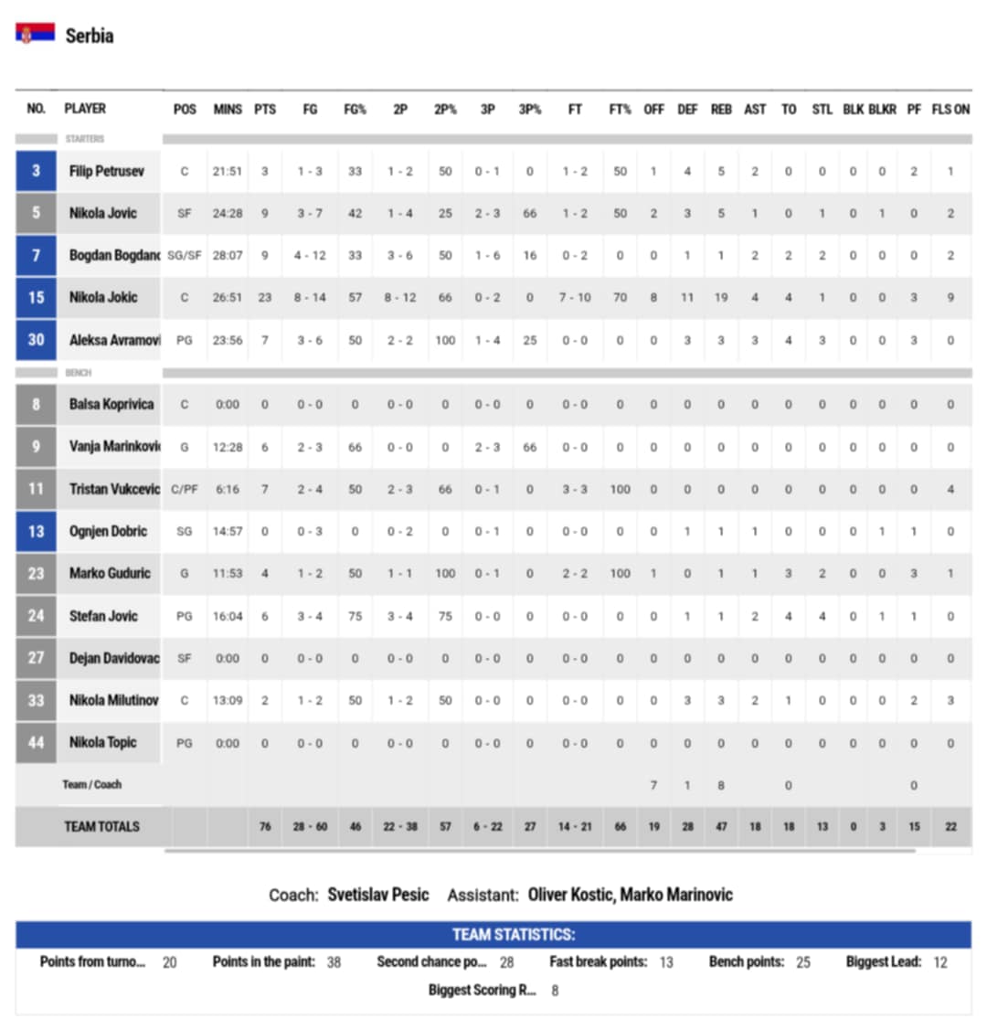 Από την Σερβία διακρίθηκε ο Γιόκιτς με double double με 23 πόντους και με 19 ριμπάουντ, ενώ οι Γιόβιτς και Μπογκντάνοβιτς έβαλαν από 9 πόντους έκαστος. Από την Ελλάδα ξεχώρισαν οι Μήτογλου, Σλούκας και Ντόρσεϊ με 18, 11 και 10 πόντους αντίστοιχα.