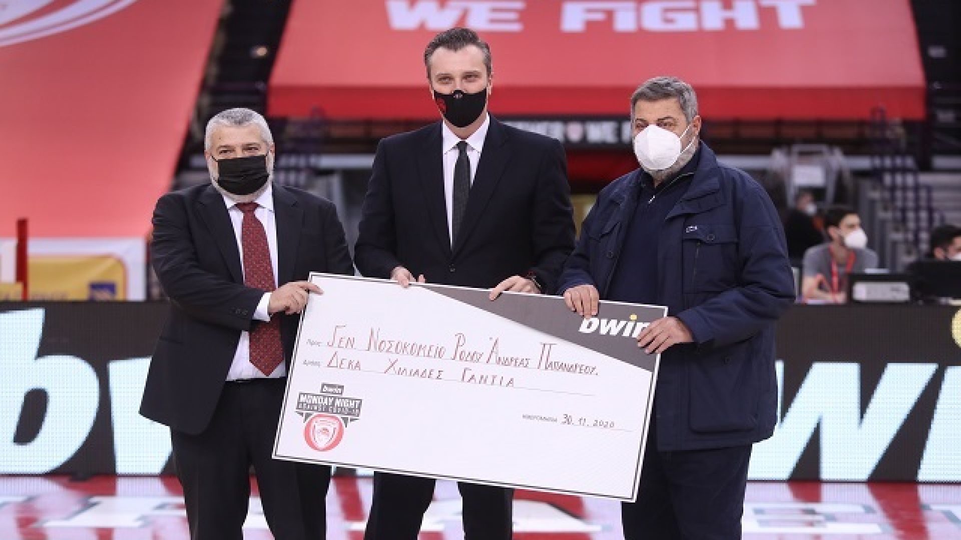 Ο Γενικός Διευθυντής της ΚΑΕ Ολυμπιακός, Νίκος Λεπενιώτης και ο Managing Director της BWIN, Ιωάννης Καποδίστριας παρέδωσαν μια επιταγή με την προσφορά 10.000 χειρουργικών γαντιών για το Νοσοκομείο Ρόδου «Ανδρέας Παπανδρέου» στον πρόεδρο του Κολοσσού, Θόδωρο Καρατζά.