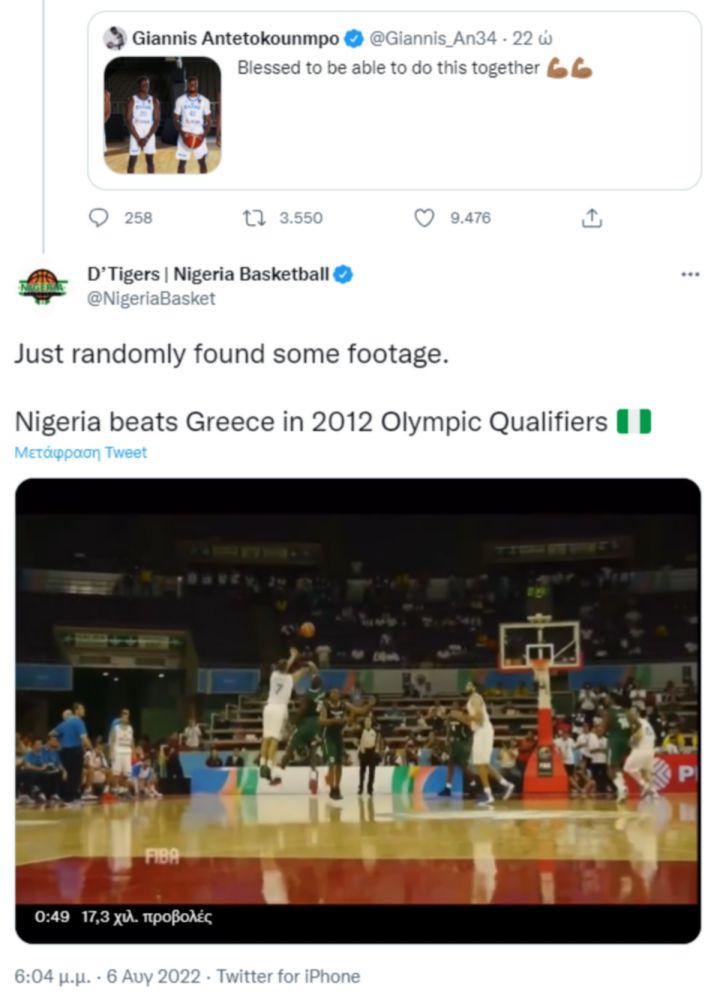 Μάλιστα θέλοντας να υποδείξουν στον Ελληνονιγηριανό σταρ ότι είναι σε... λάθος εθνική, ανέτρεξαν στην νίκη επί της Ελλάδας που σημειώθηκε στο προολυμπιακό τουρνουά της Βενεζουέλας το 2012.