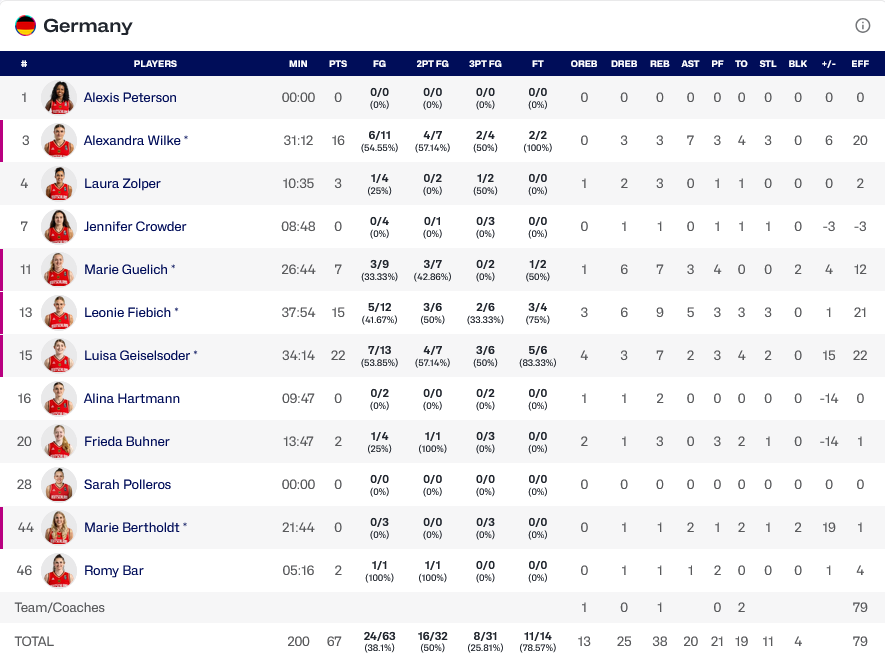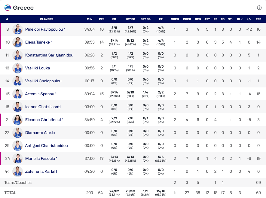 Η Φασούλα με 17 πόντους και εννέα ριμπάουντ ήταν η κορυφαία της Ελλάδας, με την Σπανού να έχει 15 πόντους και εννέα ριμπάουντ, και την Τσινέκε 14 πόντους. Για την Γερμανία, η Γκεϊσεσόλδερ είχε 22 πόντους.