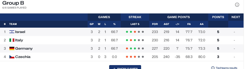 Παρά την ήττα από την Γερμανία, οι Ισραηλινοί τερμάτισαν στην πρώτη θέση του Group B και στην φάση των 16 θα βρεθούν στον δρόμο του αντιπροσωπευτικού μας συγκροτήματος.