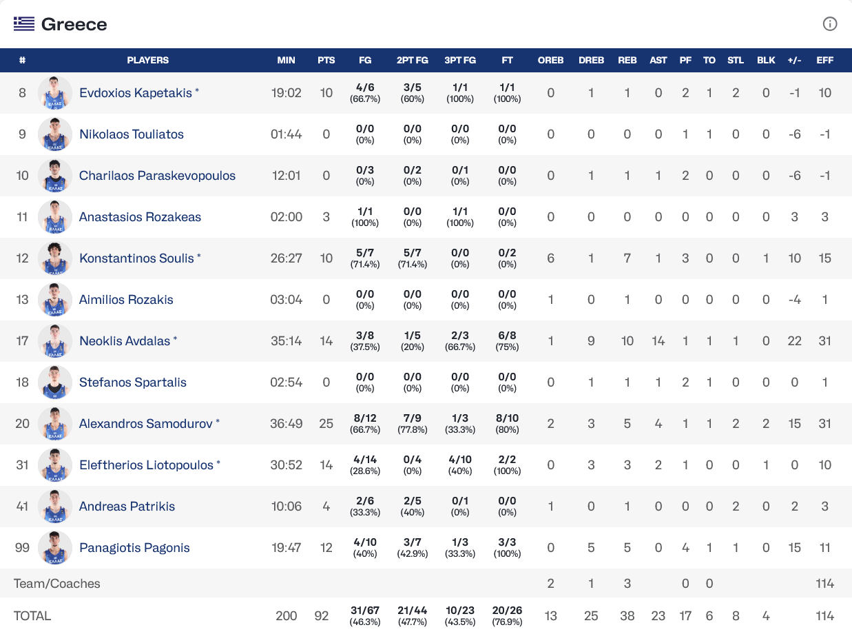 Από την Ελλάδα διακρίθηκε ο Σαμοντούροβ με 25 πόντους, με τους Αβδάλα και Λιοτόπουλο να βάζουν από 14 πόντους έκαστος και τον δε΄΄ύτερο να κάνει triple double με 10 ριμπάουντ και 14 ασίστ. Από το Ισραήλ ξεχώρισαν οι Μικαέλι και Μέιερ με 22 και 19 πόντους αντίστοιχα.