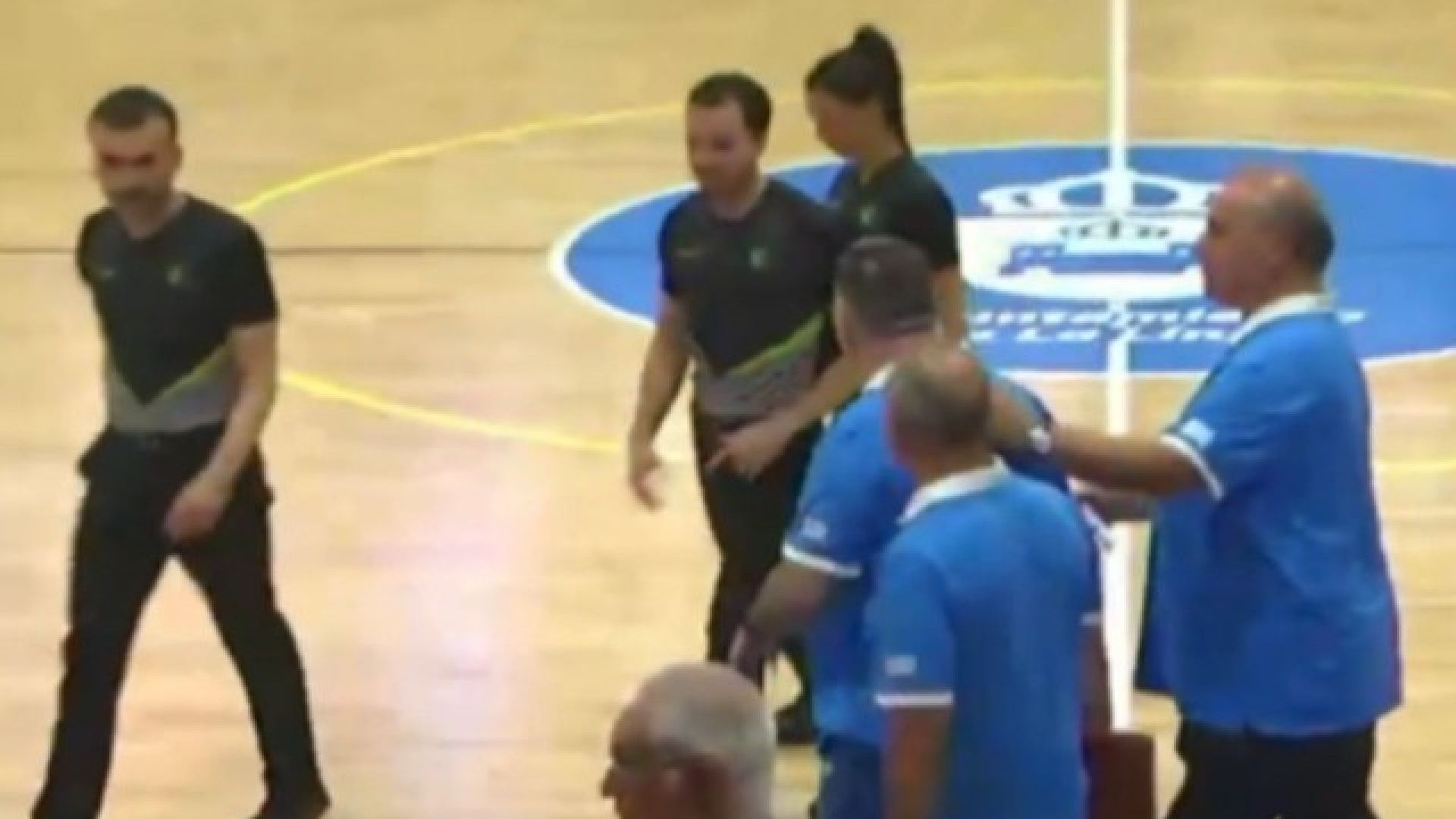 Η γαλανόλευκη ήταν μπροστά με 38-37 με 2:15 πριν το ημίχρονο να απομένουν. Ο κόουτς Μάκης Γιατράς έκανε παράπονα και διαμαρτυρίες, μ αποτέλεσμα να αποβληθεί, αλλά αρνήθηκε να φύγει για τα αποδυτήρια και κάθισε σε μια καρέκλα στην άκρη του πάγκου του.