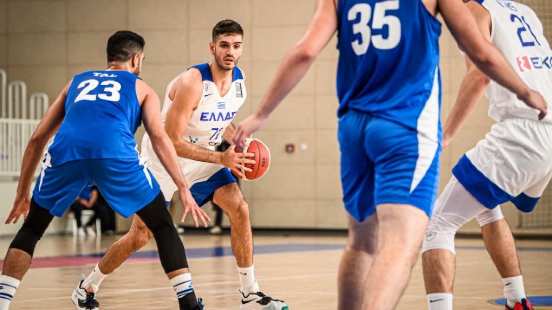 Η ομάδα του Ισραήλ μπήκε καλύτερα στον αγώνα, που άρχισε με 45λεπτη καθυστέρηση λόγω παράτασης στο παιχνίδι που προηγήθηκε. Εκμεταλλευόμενη την αποτελεσματικότητά της πίσω από τα 6,75μ. (7/15 στο πρώτο ημίχρονο) σε συνδυασμό με την αστοχία της ελληνικής ομάδας, οι Ισραηλινοί προηγήθηκαν νωρίς με διψήφιες διαφορές (6-20 με 2:29 να απομένουν για το πρώτο δεκάλεπτο) και στο ξεκίνημα της δεύτερης περιόδου έφτασαν μέχρι και στο +16 (12-28 στα 9:06 πριν το ημίχρονο). Η βελτίωση της άμυνας, αλλά και οι επιθετικές λύσεις από τον Μαντζούκα επέτρεψαν στην Ελλάδα να ψαλιδίσει τη διαφορά στους επτά πόντους στο τέλος του πρώτου ημιχρόνου, 35-42.