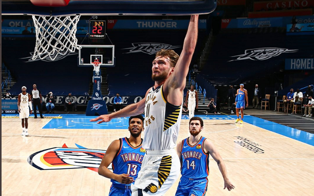 Οι Πέισερς ήταν εκπληκτική στην έδρα των Θάντερ καταγράφοντας ρεκόρ παραγωγικότητας στην ιστορία τους με την νίκη που πέτυχαν με 152-95. Δεν ήταν όμως το μοναδικό ρεκόρ που καταγράφηκε στον αγώνα, αφού ο Σαμπόνις έκανε triple-double από το ημίχρονο.