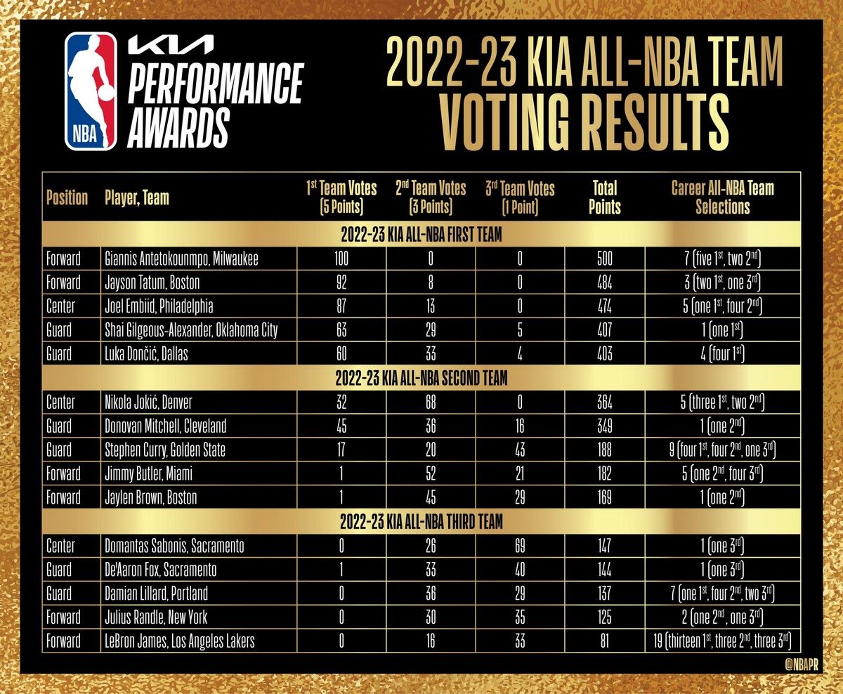 Αυτή η ψηφοφορία γίνεται κάθε χρόνο και ο Έλληνας φόργουορντ πήρε 100/100 ψήφους, ενώ στην πρώτη πεντάδα ψηφίστηκαν οι Σάι Γκίλτζιους-Αλεξάντερ (Θάντερ), Λούκα Ντόντσιτς (Μάβερικς), Τζέιτον Τέιτουμ (Σέλτικς) και Τζοέλ Εμπίντ (Σίξερς).