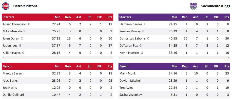 Για τους "Βασιλιάδες" οι Σαμπόνις και Μονκ πέτυχαν double double. Ο πρώτος είχε 30 πόντους και 12 ριμπάουντ και ο δεύτερος 23 πόντους και 10 ασίστ.