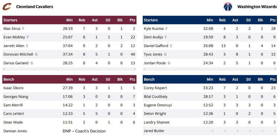 Οι απίθανοι Καβαλίερς επικράτησαν μέσα στην Ουάσινγκτον με κορυφαίο τον Ντόνοβαν Μίτσελ με 40 πόντους. Για τους γηπεδούχους ο Κούζμα πέτυχε 28.