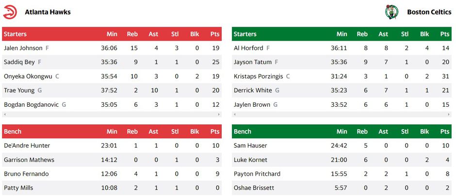 Οι πρωτοπόροι Κέλτες επικράτησαν των Χοκς στην Βοστόνη με κορυφαίο τον Κριστάπς Πορζίγκνις που σημείωσε 31 πόντους. Πρώτος σκόρερ της Ατλάντα ο Μπει με 25 πόντους.