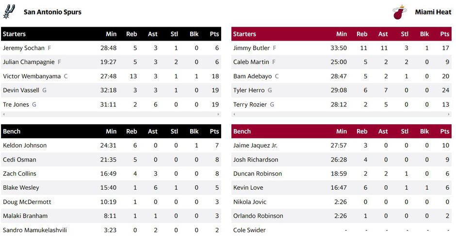 Ο Χίρο με 24 πόντους και ο Αντεμπάγιο με 20 οδήγησαν τους Μαϊάμι στην νίκη επί του Σαν Αντόνιο. Από 19 πόντους Βασέλ και Τζόουνς.