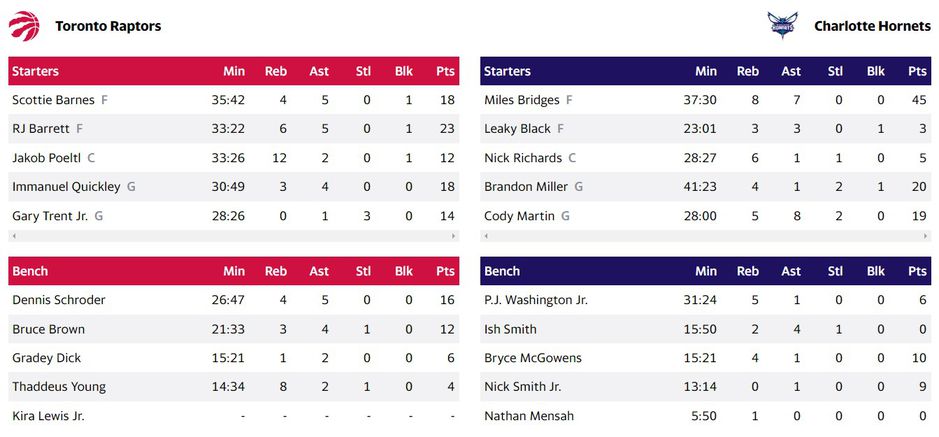 Το Τορόντο υποχρέωσε τους Χόρνετς στην 9η σερί ήττα τους. Για τους γηπεδούχους ο Μπρίτζες είχε 45 πόντους και για τους νικητές ο Μπάρετ είχε 23.