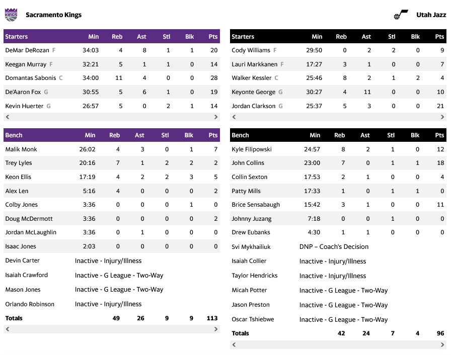 Ο Σαμπόνις με 28 πόντους και 11 ριμπάουντ ήταν ο πρωταγωνιστής για την ομάδα του Σακραμέντο, με τον ΝτεΡόζαν να προσθέτει ακόμη 20 πόντους και 8 ασίστ. Από τους γηπεδούχους, ο Τζόρνταν Κλάρκσον πέτυχε 21 πόντους και 18 είχε ο Τζον Κόλινς.