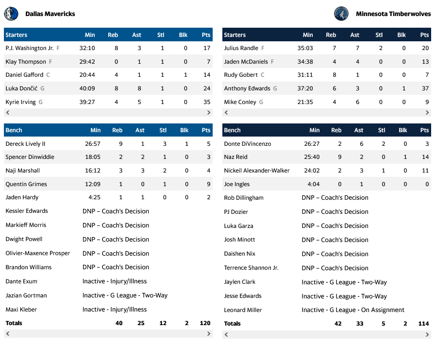 Ο "Uncle Drew" με 35 πόντους ήταν ο πρωταγωνιστής των Μαβς, με τον Λούκα Ντόντσιτς να πετυχαίνει 24 πόντους μαζί με 8 ασίστ και 8 ριμπάουντ. Από την πλευρά των Λύκων, ο Έντουαρτς σταμάτησε στους 37 πόντους, με τον Ραντλ να προσθέτει ακόμη 20, χωρίς όμως να είναι αρκετοί για κάτι καλύτερο.