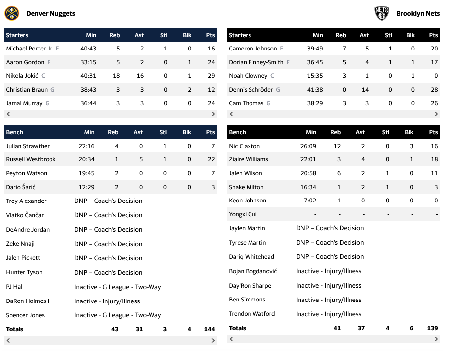 Ο "Joker" σημείωσε ένα φοβερό triple-double με 29 πόντους, 8 ριμπάουντ και 16 ασίστ, σημειώνοντας και το καλάθι που έστειλε το ματς στην παράταση, με τους Γκόρντον και Μάρει να πετυχαίνουν από 24 ακόμη πόντους ΄εκαστος. Από το Μπρούκλιν, οι Σρέντερ και Τόμας με 28 και 26 πόντους αντίστοιχα ήταν αυτοί που ξεχώρισαν.