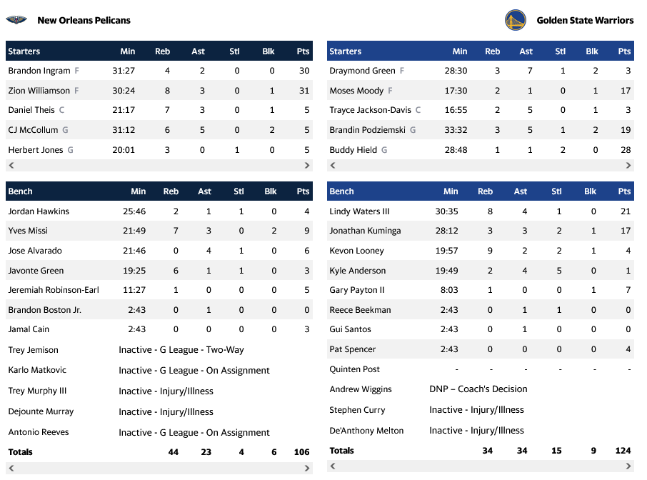 Πρωταγωνιστής για τους "Πολεμιστές" ήταν ο Μπάντι Χιλντ με 28 πόντους, ενώ 21 πρόσθεσε ο Λίντι Γουότερς. Από την ομάδα της Νέας Ορλεάνης ξεχώρισαν οι Γουίλιαμσον και Ίνγκραμ με 31 και 30 πόντους αντίστοιχα, αλλά ήταν και οι μοναδικοί διψήφιοι των Πελεκάνων.