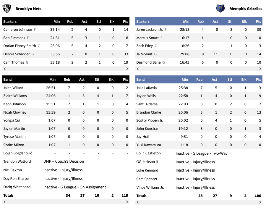 Οι μαχητικοί Νετς "άλωσαν" το Μέμφις, φτάνοντας στη δεύτερη τους νίκη με σκορ 106-119 στην φετινή regular season, με επιθετικό πλουραλισμό και ηγέτη τον Ντένις Σρέντερ.