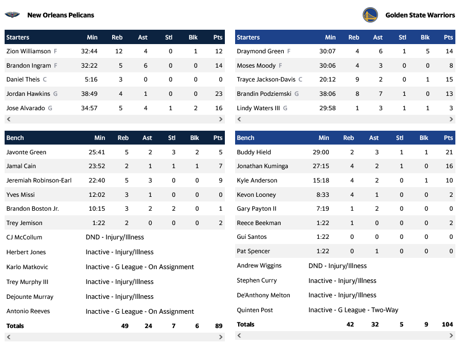 Ο Μπάντι Χιλντ με 21 πόντους ήταν ο πρ΄ωτος σκόρερ των "Πολεμιστών", με τους Ποντζιέμσκι και Τζάκσον-Ντέιβις να τα κάνουν όλα μέσα στο παρκέ. Για τους "Πελεκάνους", Χόκινς και Αλβαράντο ήταν αυτοί που ξεχώρισαν, πετυχαίνοντας 23 και 16 πόντους αντίστοιχα.