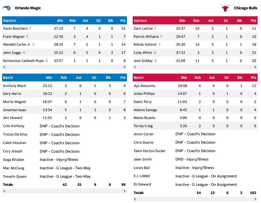 Πρώτος σκόρερ ο Γουάιτ με 21 πόντους, με πολύτιμη συνεισφορά των Βούτσεβιτς (18π, 14ρ) και Γκίντι (20π, 11ασ) που πέτυχαν double-double. Για την ομάδα του Ορλάντο, ο Μπανκέρο με 31 πόντους και 7 ριμπάουντ προσπάθησε αλλά δεν ήταν αρκετό.