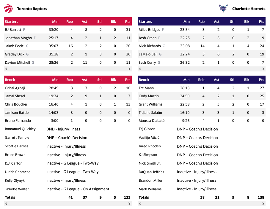 Κορυφαίος για τους Χόρνετς ο Ρίτσαρντς με 24 πόντους και 14 ριμπάουντ, με τον Τρε Μαν να είναι πρώτος σκόρερ με 27 πόντους. Από τους "Ράπτορες", ο Μπάρετ με 31 πόντους και 8 ασίστ ήταν αυτός που ξεχώρισε.